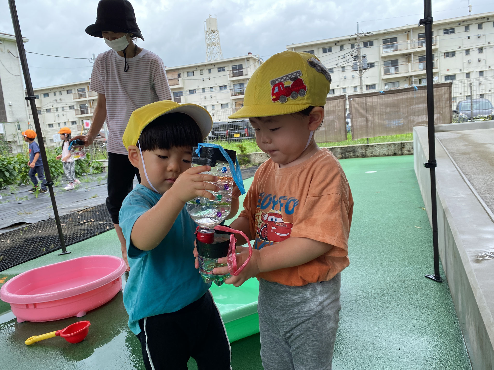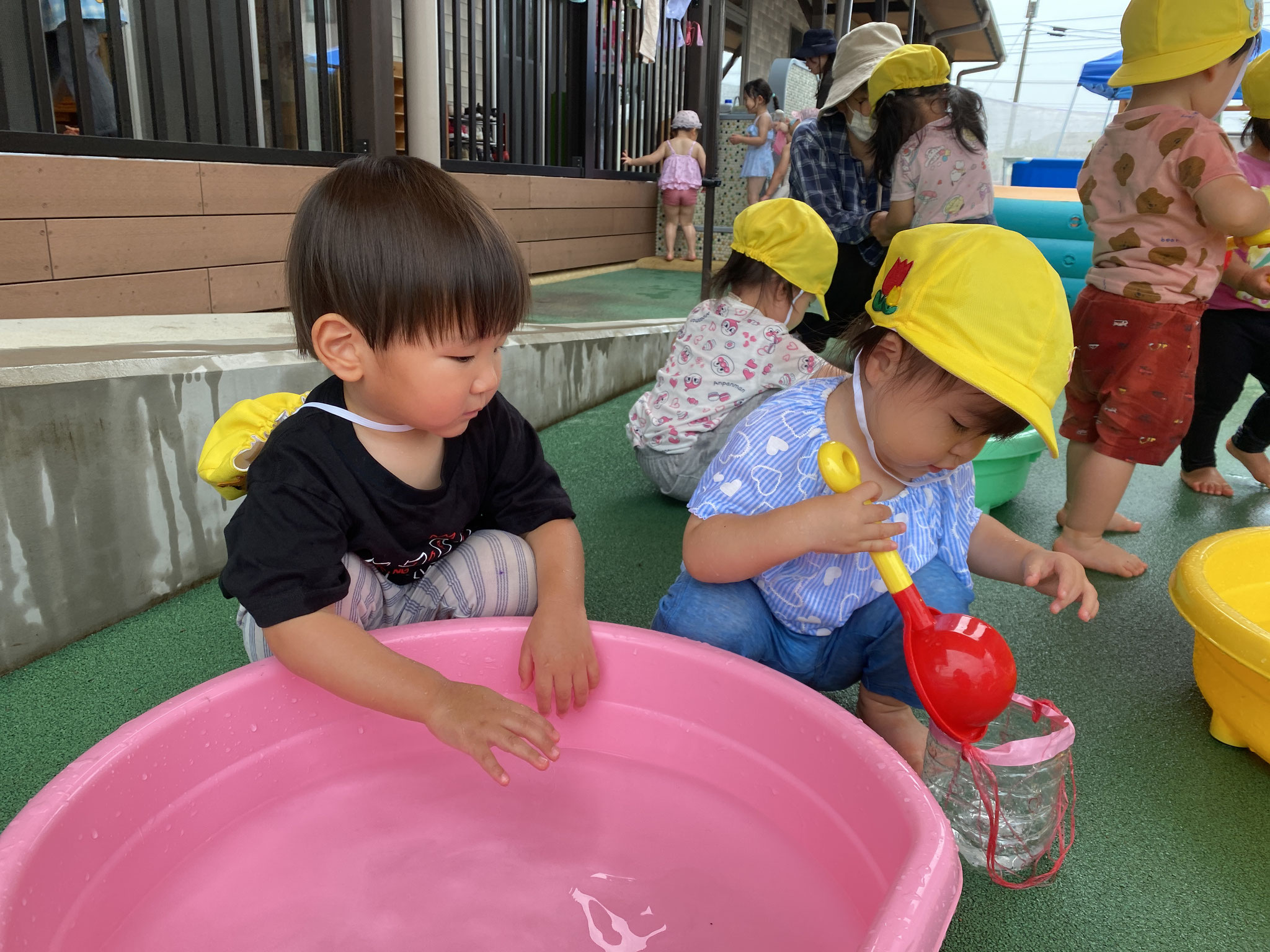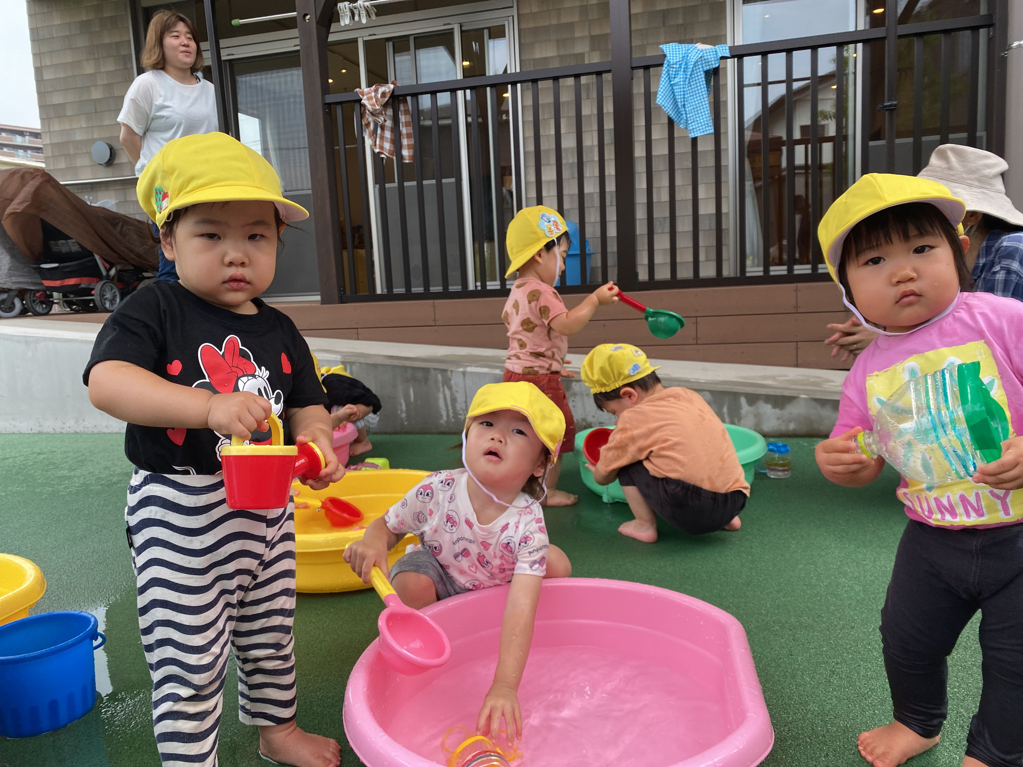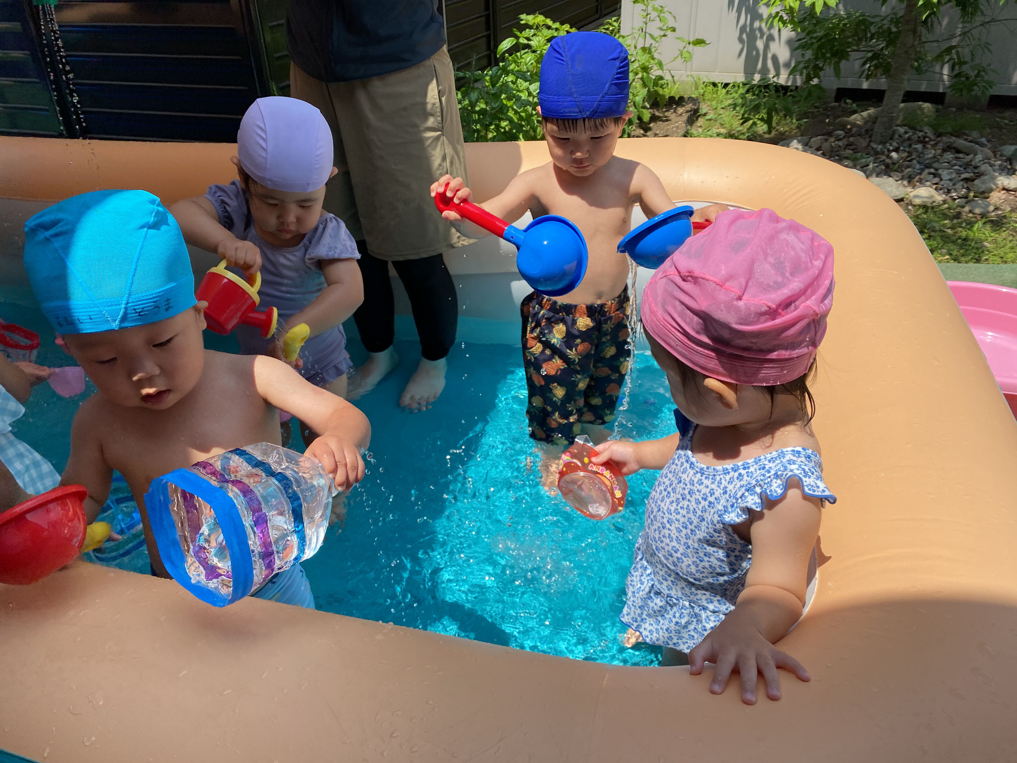 22日 8月 2025 こねこ組便り 今回は、こねこ組からです。 プールが始まって2ヶ月が経ち、 日に日に水に慣れ 遊び方もダイナミックに。 スコップに水を入れ、 みんなでかけ合う姿も 見られます。 水遊びの終盤では、 水が溜まった地面を ピチャピチャ歩いて、 水の感触を楽しんでいました。 (柴田) tagPlaceholderカテゴリ: