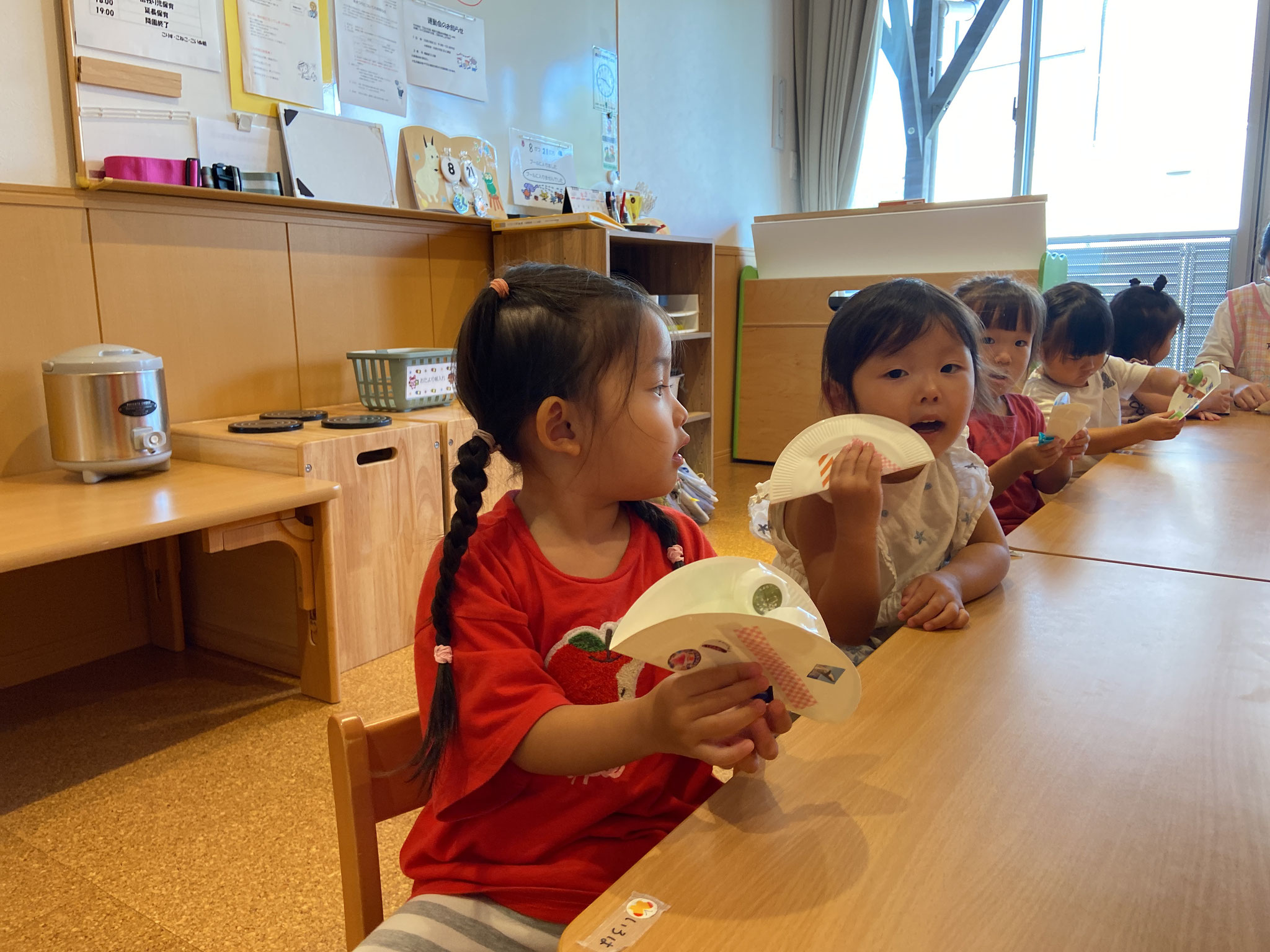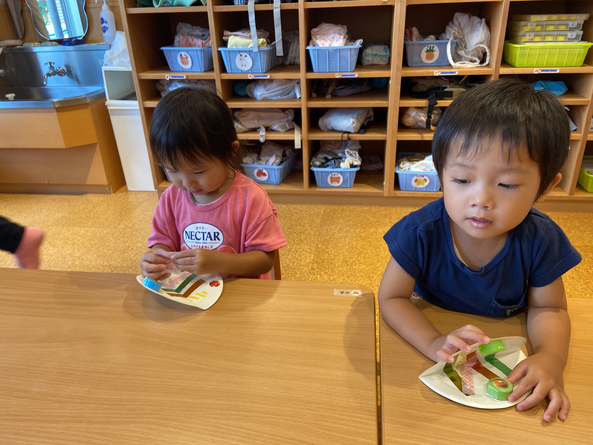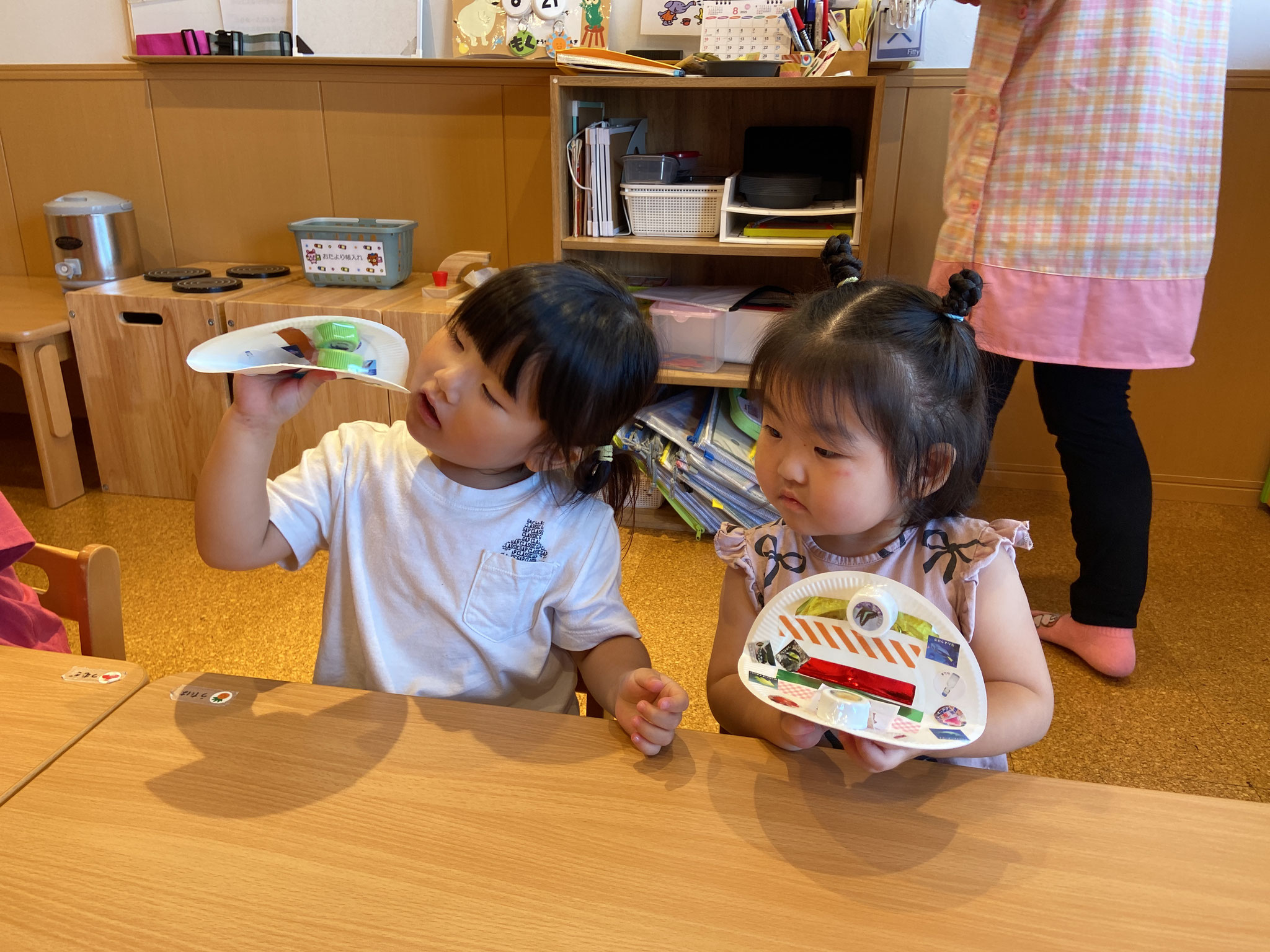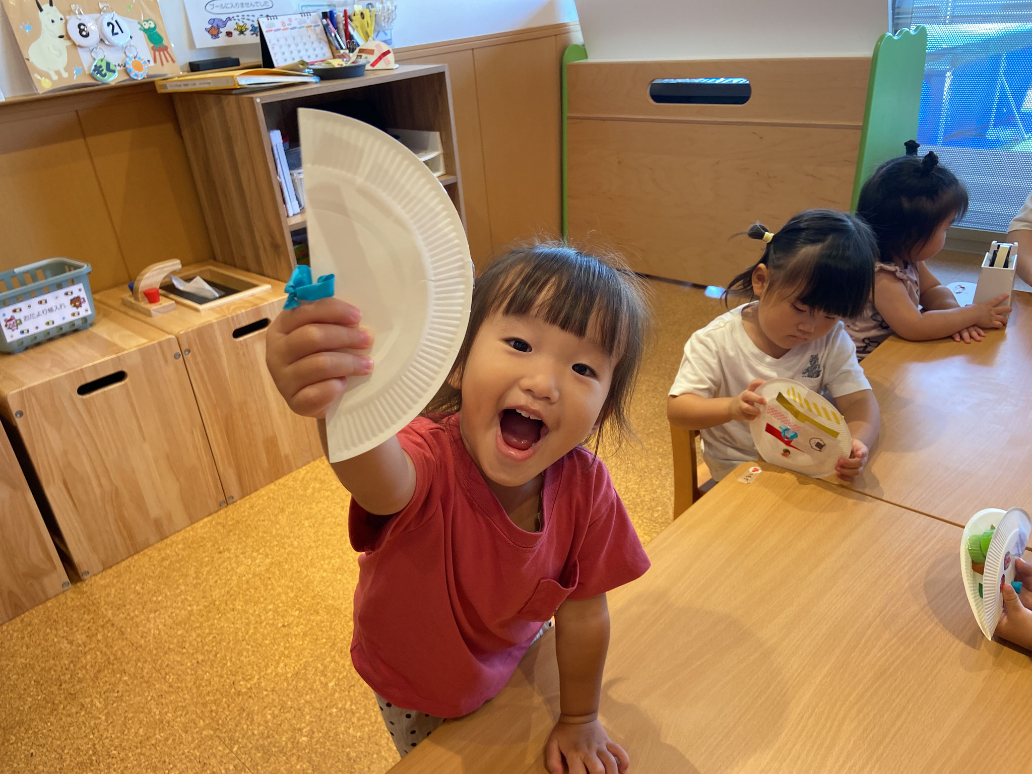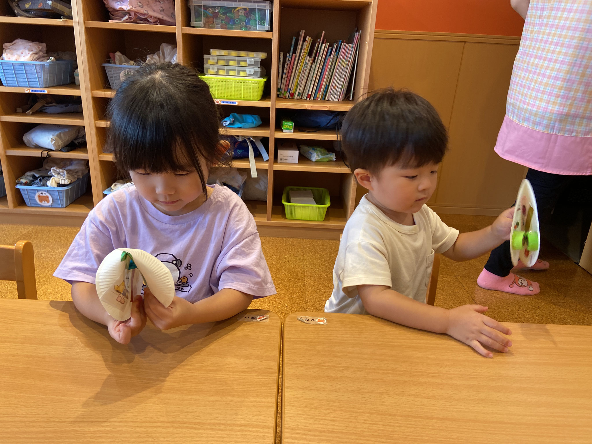 29日 8月 2025 こいぬ組便り 今回はこいぬ組からです。 タンバリンやカスタネットなど 音を鳴らして遊んだ後、 紙皿で自分だけの 楽器を作りました。 真っ白な紙皿を マスキングテープや丸シールで飾り付けました。 手作り楽器が出来上がると 嬉しそうに音を鳴らして 楽しんでいました! みんな音楽が大好きなので 今後も活動に楽器を取り入れ 楽しく遊べるように 工夫していきます。 (島貫) tagPlaceholderカテゴリ: