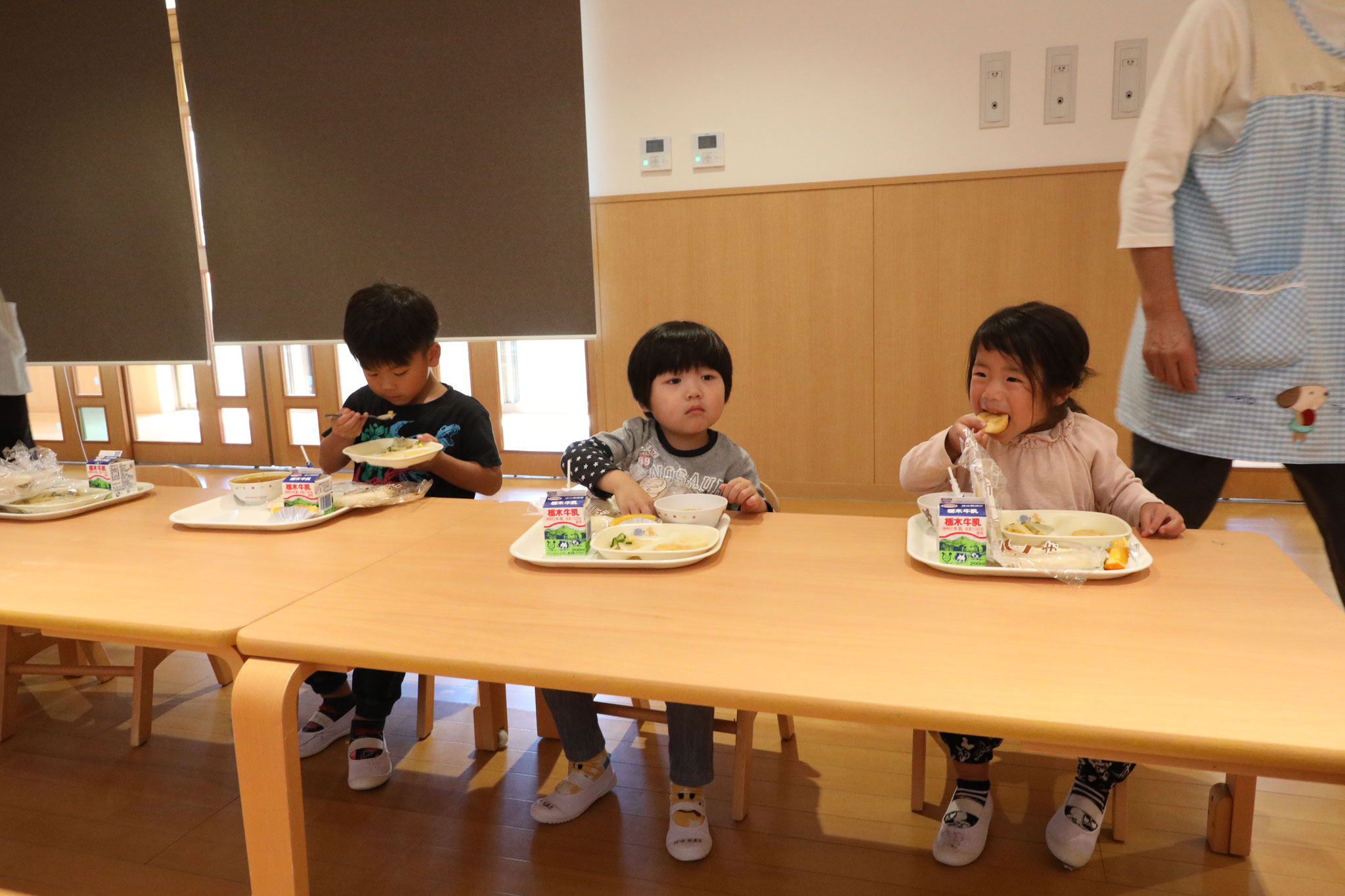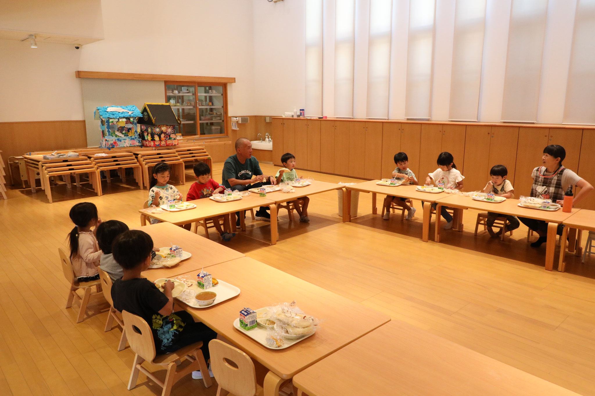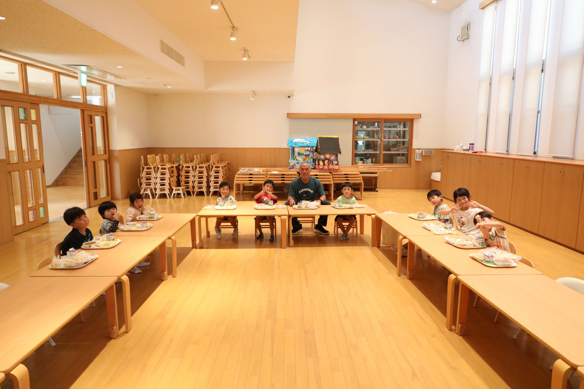 今日は10月生まれの3・4・5歳クラスのお友達をお祝いする、誕生日会食会を行いました。今回の参加者は9名、温かい雰囲気の会となりました。まずはそれぞれのお友達の紹介、そして会食スタートです。今回は園長先生、三柴先生、そして川口先生が会食に参加です。給食には珍しいナンがでて、子どもたちも先生と一緒にナンについてお話がはずんでいたようです。